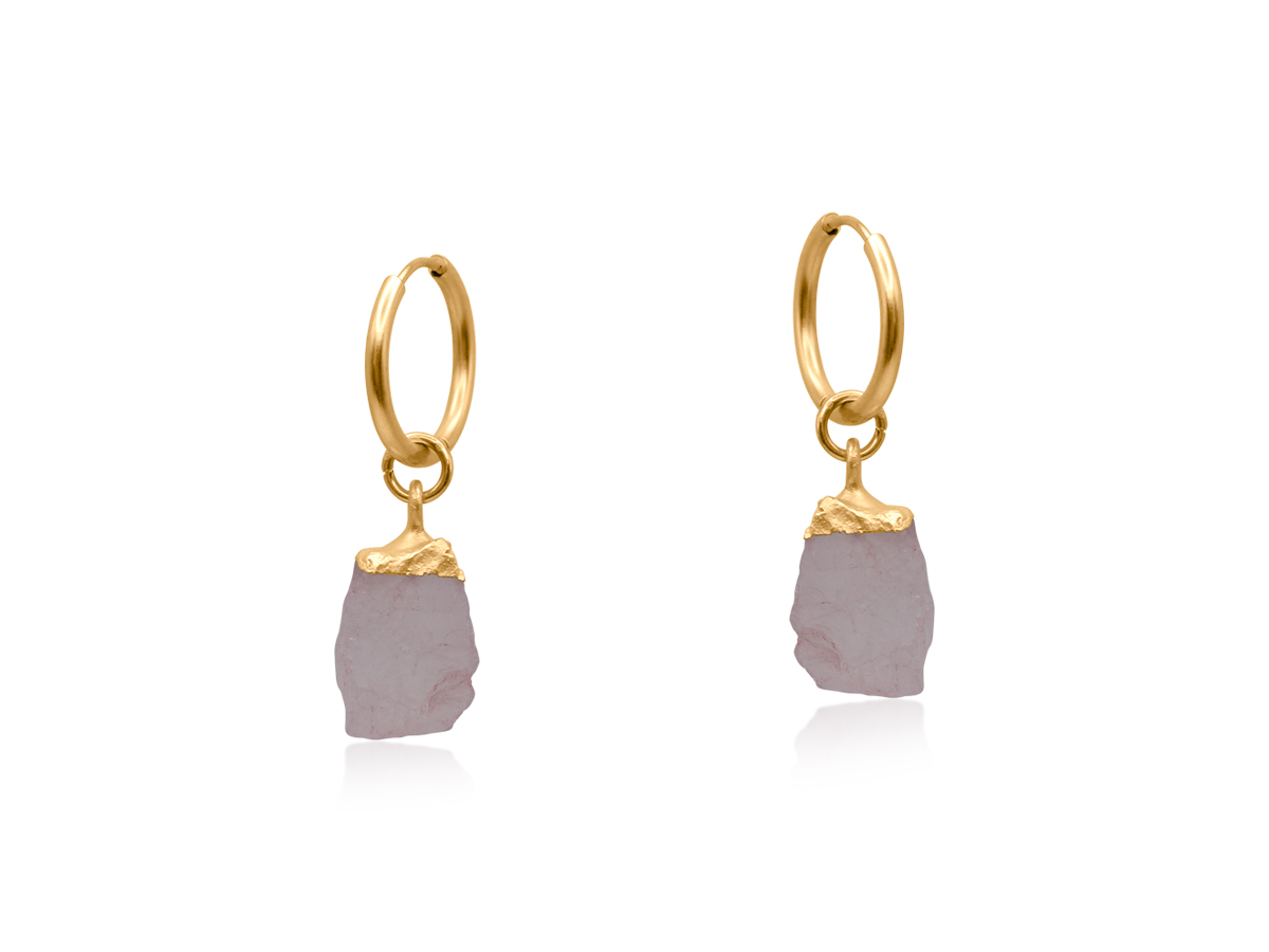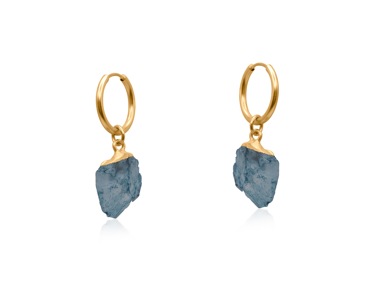 These handcrafted raw stone Huggies earrings feature a textured crystal drop suspended from a sleek gold hoop. Available in blue, pink, or green, each stone is left unpolished to highlight its natural form—bringing an earthy, organic beauty to this refined design. A perfect blend of nature-inspired texture and modern elegance, these earrings add a grounded yet elevated touch to your everyday or occasion looks. At least 50% of the brass used in the jewellery we make is recycled from leftover/overhead materials. All posts are hypoallergenic and made from surgical steel.