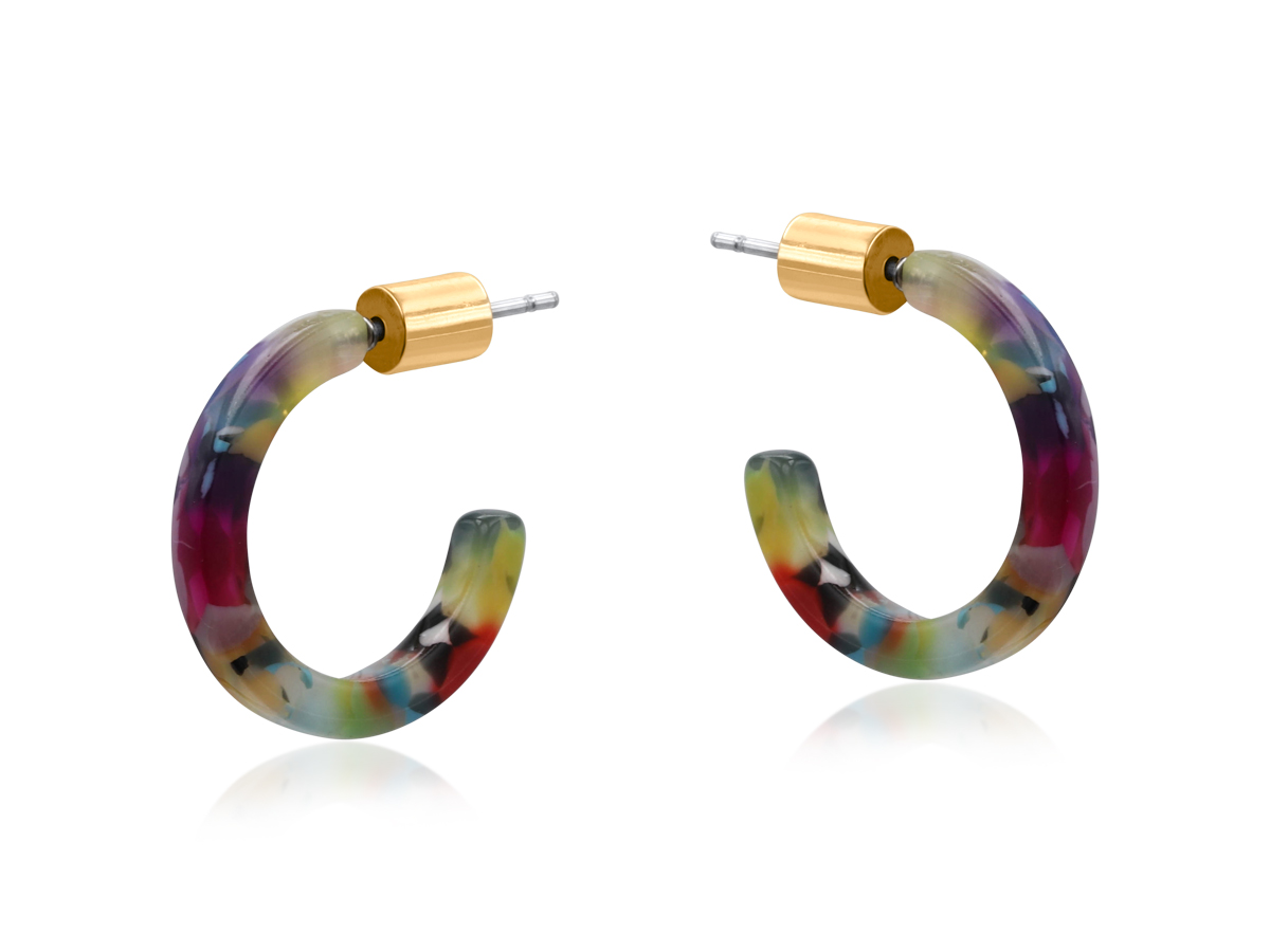 Make a statement with these modern resin hoop earrings—crafted for those who love clean lines with a burst of personality. Their smooth, translucent curves are formed using recycled resin, giving each pair a unique, marbled finish that subtly shifts in tone and texture. Designed for all-day comfort with hypoallergenic surgical steel posts and gold-plated accents, these hoops offer the perfect blend of lightweight wear and bold detail. Whether paired with a sleek outfit or layered with other favourites, they bring a polished, contemporary touch to your everyday look.