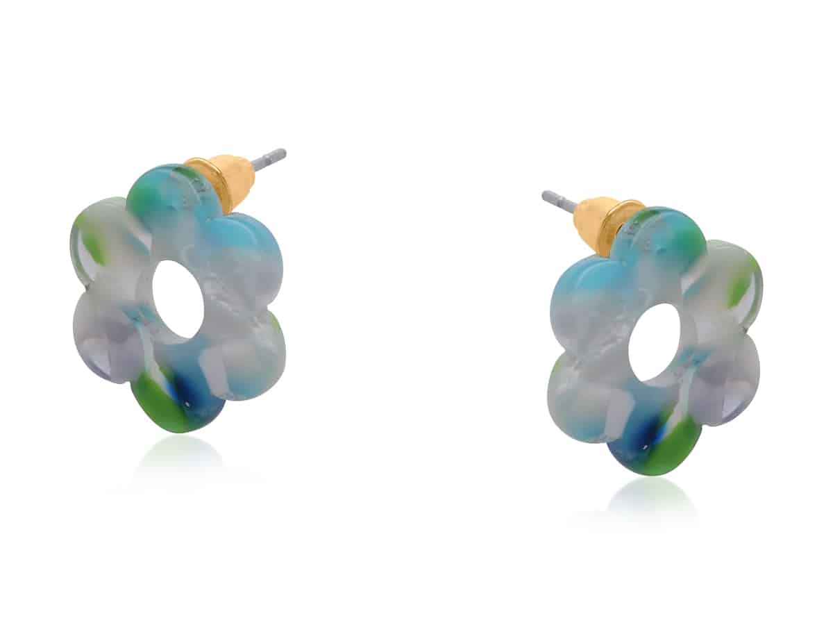 Each pair is handcrafted from sustainable resin made using recycled eyewear off-cuts, ensuring natural variation in colour and pattern so no two are exactly alike. Lightweight and comfortable, they are finished with hypoallergenic surgical steel posts for durability.