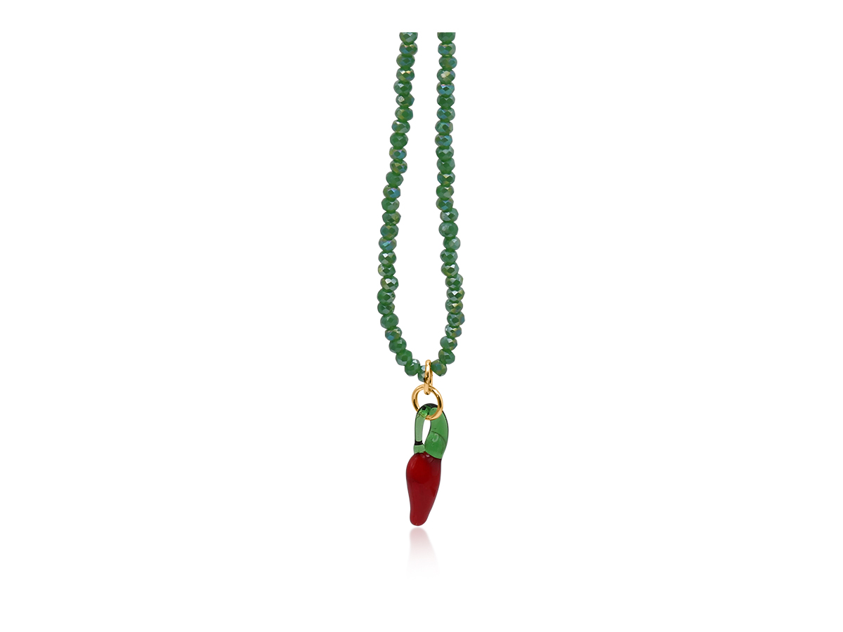 This beautiful handcrafted necklace features a glossy red chilli charm with a translucent green top, adding a fiery twist to the delicate beaded chain. A standout piece that brings spice, attitude, and colour to any outfit, all year round. Crafted with sustainability in mind, at least 50% of the brass we use in the jewellery is recycled from leftover/overhead materials.