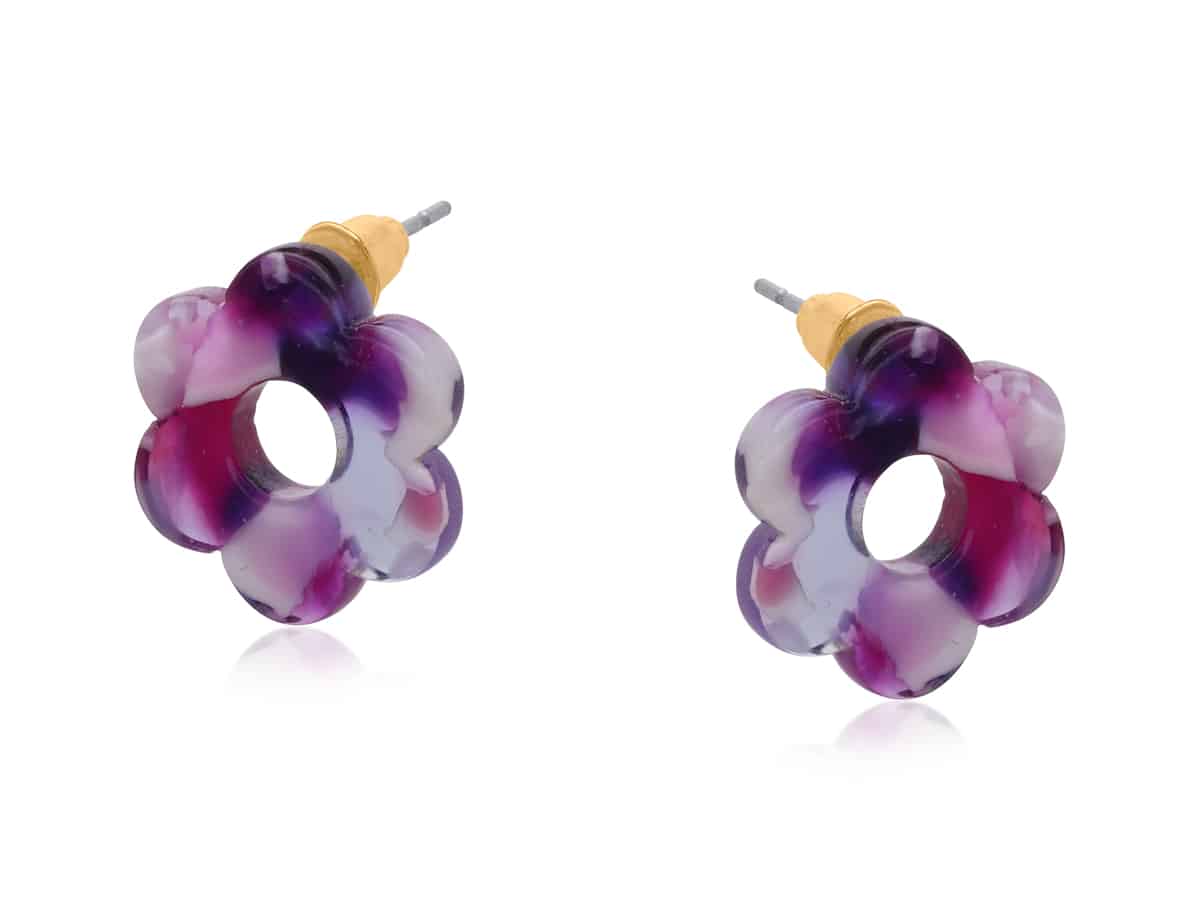 Each pair is handcrafted from sustainable resin made using recycled eyewear off-cuts, ensuring every flower carries unique colour variation. Lightweight and comfortable, they are finished with hypoallergenic surgical steel posts.