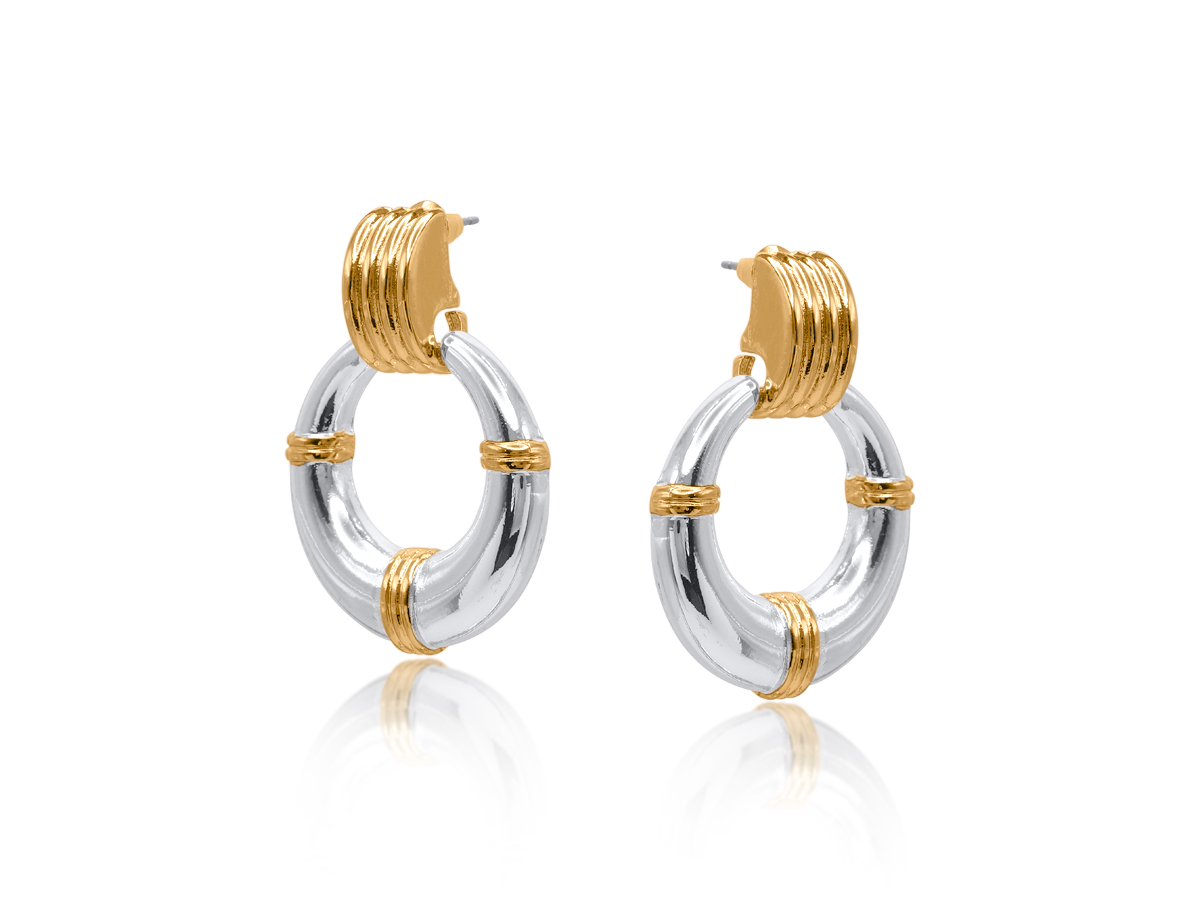 Bold and contemporary, the Melania Two Tone Statement Earrings combine sculptural form with contrasting metal finishes for striking visual impact. Their confident silhouette brings dimension and modern edge to any look.