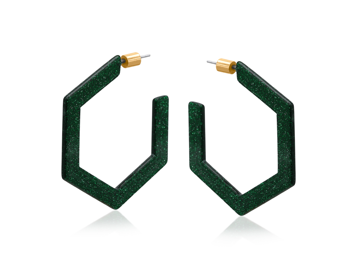 Sculptural and bold, these angular hoop earrings feature glittering red, green, or blue colours for a dazzling, statement-making finish. With sharp geometric lines and a high-shine sparkle, they exude modern glamour—perfect for elevating evening looks or adding drama to daytime ensembles. Crafted from upcycled resin and finished with hypoallergenic surgical steel posts, they blend sustainable design with show-stopping allure.