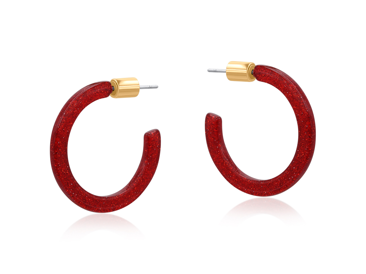 These resin hoops reimagine a classic silhouette with a dazzling twist. Offered in glittering shades of red, green, or blue, they deliver an eye-catching burst of colour and luminous shine. Whether you’re dressing up for a special occasion or adding a flash of glamour to your everyday look, these earrings are your go-to statement piece. Made from up-cycled resin with hypoallergenic surgical steel posts for effortless, all-day wear.