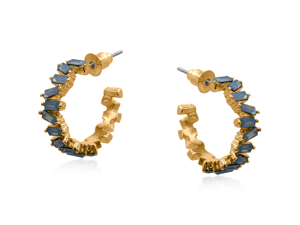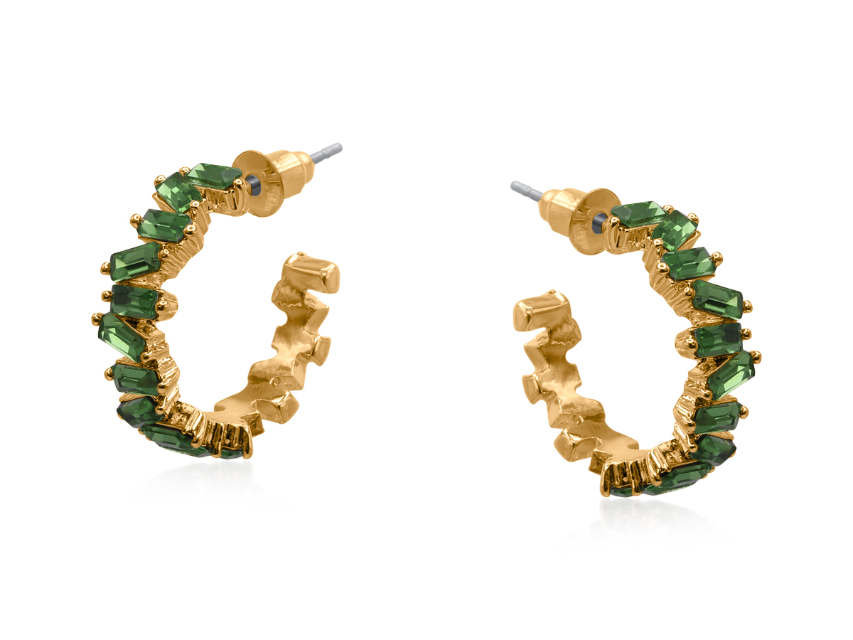 These handcrafted Siren’s Home Hoop Earrings feature a row of shimmering baguette-cut stones set in a sleek gold open hoop. Available in cool ocean blue or vivid emerald green, they bring colour, movement, and a touch of glamour to any jewellery collection. At least 50% of the brass used in the jewellery we make is recycled from leftover/overhead brass. All posts are hypoallergenic and made from surgical steel.